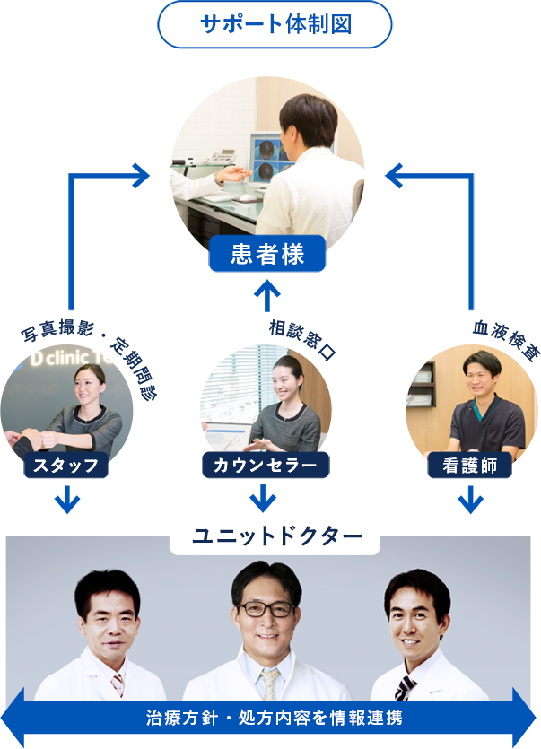 DクリニックのAGA治療は、医師・看護師・カウンセラー・スタッフといった患者さまに関わる全員がユニットチームとなり、継続的にサポートをいたします。